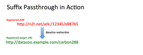 Basically, Suffix Passthrough makes every ARK the root of its own “namespace”. Any user-added suffix, which is a common way to form sub-object identifiers, will be passed through to the registered target object. For example, a dataset with a million component parts and just this one “ancestor” ARK,